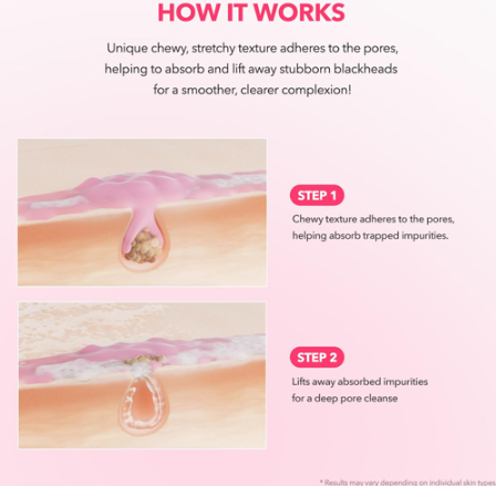 [Pink Bubble Gum Cleanser for Blackhead & Pore Care] Unique chewy, stretchy formula adheres to skin, helping to absorb and lift away blackheads, pore-clogging impurities, and excess sebum for a smoother skin.