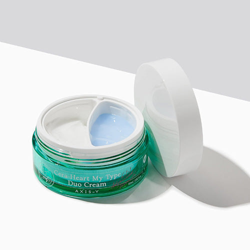 Cera-Heart My Type Duo Cream is a two in one cream product which features two different types of cream in one jar. One side is a blue gel-type cream and the other side is a thicker white cream. The gel-type cream is typically used on the oilier T-zone while the thicker cream is typically used on the dryer U-zone.