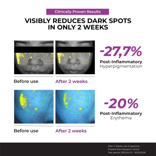 Dermatologically tested formula delivers -27.7% reduction in hyperpigmentation and -20% in redness after 2 weeks.
