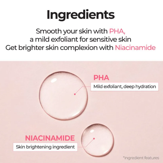 • Smooths your skin with PHA, a mild exfoliant for sensitive skin.