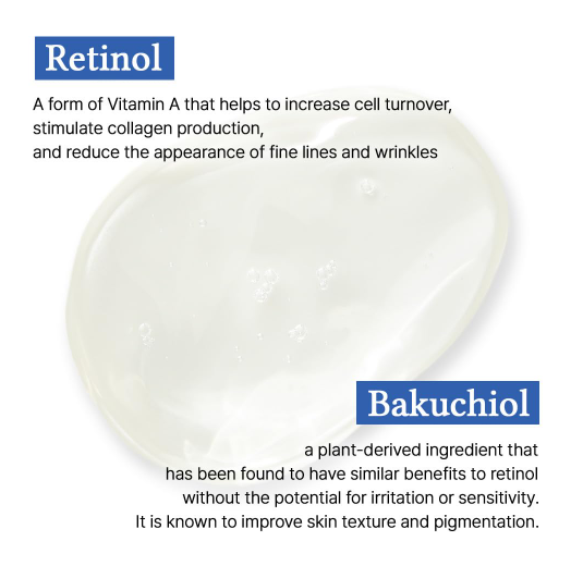 A moisturizing serum formulated with Retinol that helps enhance skin elasticity and reduce the appearance of fine lines and wrinkles. Features Bakuchiol that helps improve skin texture and reduce pigmentation. Contains Panthenol, Soybean Oil and Betula Alba Juice that moisturize the skin and keep the skin soft and smooth. The lightweight gel-like texture enables quick and thorough absorption to the skin without stickiness.