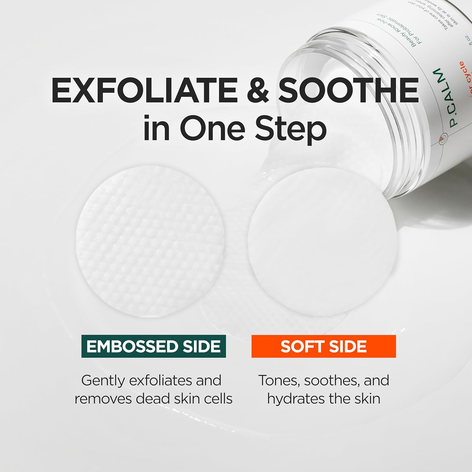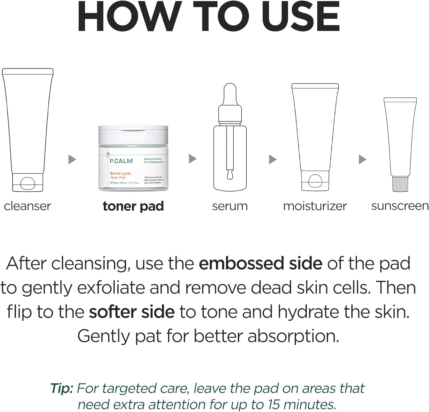 P.CALM Barrier Cycle Toner Pad is a gentle toner suitable for easily irritated sensitive skin. By removing accumulated sebum and exfoliating dead skin cells, the Barrier Cycle Toner Pad helps regulate the skin's regeneration cycle from damaged skin to normal skin in 28 days. P.CALM Barrier Cycle Toner Pads gently melts the remaining traces of excess sebum and stubborn dead skin cells after cleansing. -GENTLE DAILY TONER: To minimize irritation, this mild toner uses soft cotton pads and exfoliants found in naturally derived enzyme. Also, removed 20 harmful ingredients ,artificial colors and fragrance for sensitive irritated skin. -POWER HYDRATION : Fulfills your skin moisture needs. Helps regulate barrier damaged skin to normal, healthy glowing skin. -ACNE TONER- Not only is it great for sensitive skin, but it also includes ingredients such as, KMX Biome, to help reduce acne. It removes remaining traces of excess sebum and exfoliates stubborn dead skin cells, Which are potential causes of enlarged pores. It prevents the skin from break outs. -GREAT FOR EVERYONE- Irritation skin test completed, making the toner great for everyone to use safely.