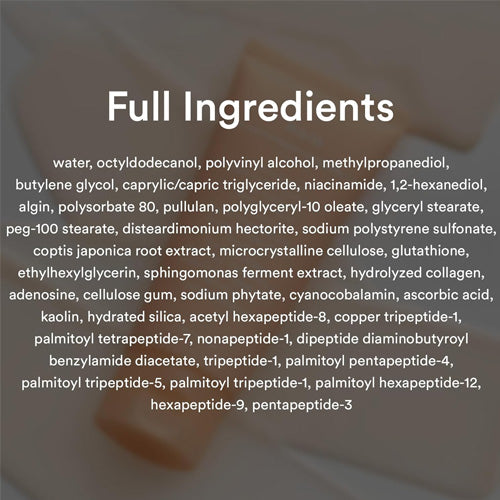 Water, Octyldodecanol, Polyvinyl Alcohol, Methylpropanediol, Butylene Glycol, Caprylic/Capric Triglyceride, Niacinamide, 1,2-Hexanediol, Algin, Polysorbate 80, Pullulan, Polyglyceryl-10 Oleate, Glyceryl Stearate, Peg-100 Stearate, Disteardimonium Hectorite, Sodium Polystyrene Sulfonate, Coptis Japonica Root Extract, Microcrystalline Cellulose, Glutathione, Ethylhexylglycerin, Sphingomonas Ferment Extract, Hydrolyzed Collagen, Adenosine, Cellulose Gum, Sodium Phytate, Cyanocobalamin, Ascorbic Acid, Kaolin, Hydrated Silica, Acetyl Hexapeptide-8, Copper Tripeptide-1, Palmitoyl Tetrapeptide-7, Nonapeptide-1, Dipeptide Diaminobutyroyl Benzylamide Diacetate, Tripeptide-1, Palmitoyl Pentapeptide-4, Palmitoyl Tripeptide-5, Palmitoyl Tripeptide-1, Palmitoyl Hexapeptide-12, Hexapeptide-9, Pentapeptide-3
