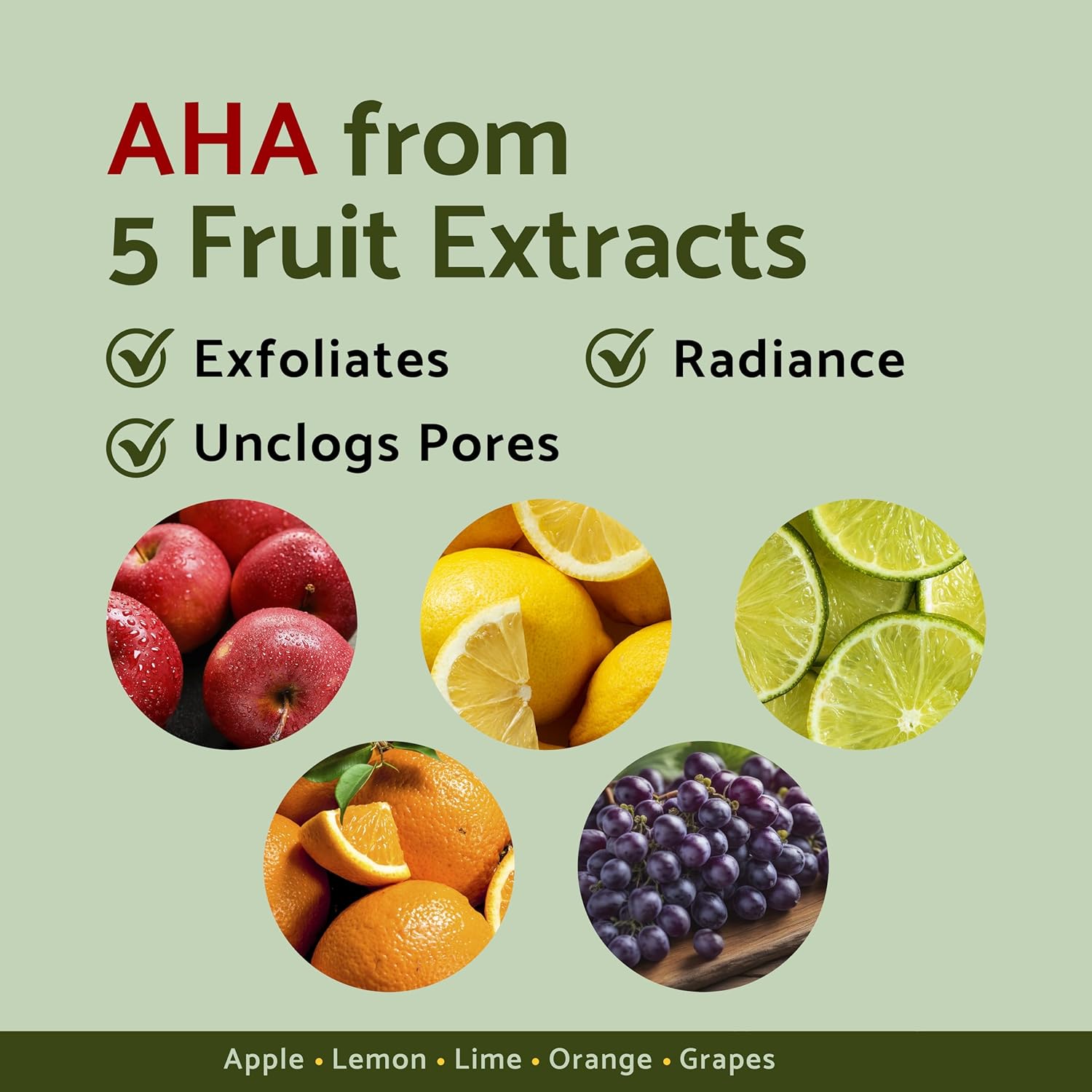 Formulated with AHA Fruits Complex containing 5 different fruit extracts including Lime, Grape, Orange, Apple, Lemon.
