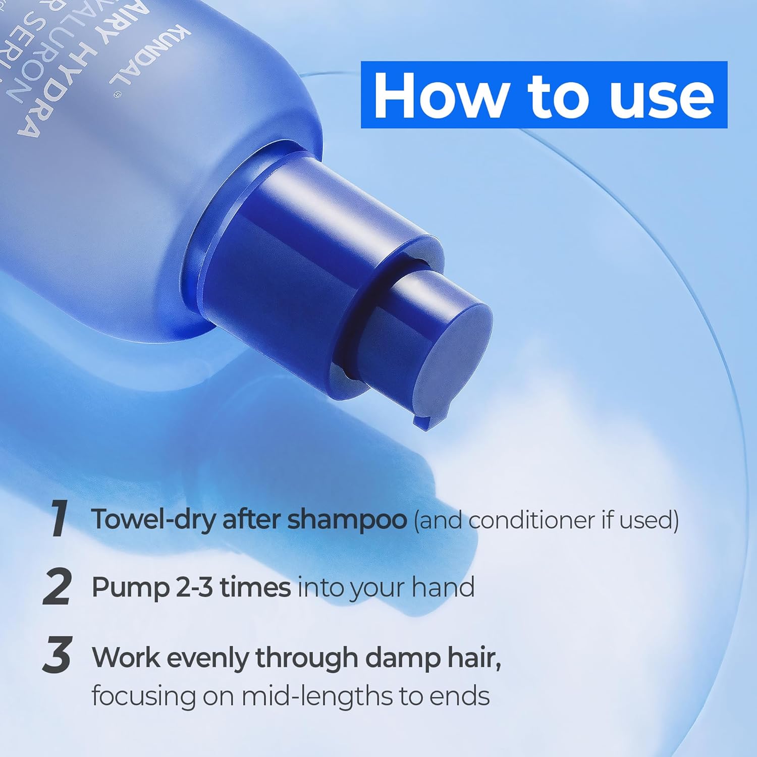 Pump a small amount (1–2 pumps for short hair, 3–4 for long hair) into your palms.