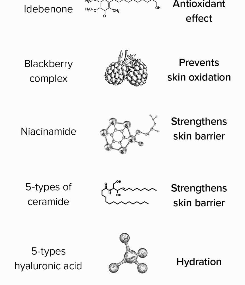 [Sensitive Soothing Gel Cream] Houttuynia Cordata Extract, Melaleuca Alternifolia (Tea Tree) Extract, Glycerin, Butylene Glycol, 1,2-Hexanediol, Caprylic/Capric Triglyceride, Ethylhexyl Palmitate, Purified Water, Polyglyceryl-3 Methylglucose Distearate, Isododecane, Panthenol, Arginine, Acrylates/C10-30 Alkyl Acrylate Crosspolymer, Ammonium Acryloyldimethyltaurate/VP Copolymer, Ethylhexylglycerin, Caprylyl Glycol, Pentylene Glycol, Disodium EDTA, Dipotassium Glycyrrhizate, Glyceryl Acrylate/Acrylic Acid Copolymer, Sodium Hyaluronate, Sodium Hyaluronate Crosspolymer, Hydrolyzed Hyaluronic Acid, Hyaluronic Acid, Hydrolyzed Sodium Hyaluronate [Idebenone Blackberry Intense Cream] Rubus Fruticosus (Blackberry) Fruit Extract (21%), Euterpe Oleracea Fruit Extract (21%), Vaccinium Angustifolium (Blueberry) Fruit Extract (21%), Glycerin, Butylene Glycol, Purified Water, Caprylic/Capric Triglyceride, 1,2-Hexanediol, Niacinamide, Cetearyl Alcohol, Cetyl Ethylhexanoate, Isododecane, Ethylhexyl Palmitate, Cetearyl Olivate, Panthenol, Polyglyceryl-3 Methylglucose Distearate, Polyglyceryl-10 Laurate, Sorbitan Olivate, Sodium Polyacrylate, Hydrogenated Lecithin, Ammonium Acryloyldimethyltaurate/VP Copolymer, Acrylates/C10-30 Alkyl Acrylate Crosspolymer, Arginine, Hydrogenated Polydecene, Ethylhexylglycerin, Hydroxydecyl Ubiquinone (500ppm), Adenosine, Pentylene Glycol, Trideceth-6, Disodium EDTA, Glyceryl Acrylate/Acrylic Acid Copolymer, Sodium Hyaluronate, Caprylyl Glycol, Sodium Hyaluronate Crosspolymer, Stearic Acid, Hydrolyzed Hyaluronic Acid, Hyaluronic Acid, Hydrolyzed Sodium Hyaluronate, Ceramide NP, Ceramide NS, Phytosphingosine, Cholesterol, Ceramide AS, Ceramide AP, Ceramide EOP