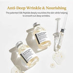 Three steps of lifting system of caring deep wrinkle with Silk Peptide and 13 types Peptide Complex, minor wrinkle with two different size collagen, and elasticity with Volufiline.