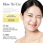 Day – Use every other day. Apply a small amount to clean, dry skin, then finish with sunscreen for protection.