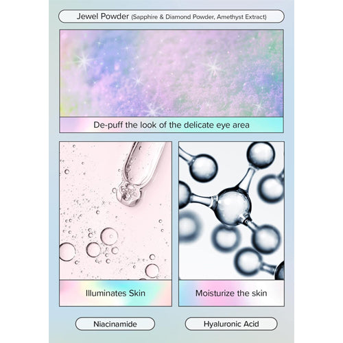 - Jewel Powder(Sapphire & Jade Powder, Amethyst Extract): helps de-puff the appearance of the under eye area, improve appearance of dark circles and provide luminosity to the area.