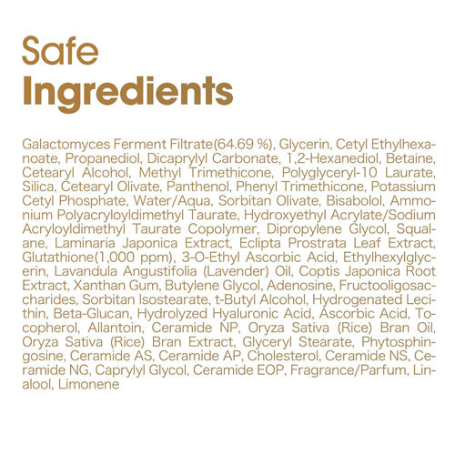 Galactomyces Ferment Filtrate, Glycerin, Cetyl Ethylhexanoate, Propanediol, Dicaprylyl Carbonate, 1,2-Hexanediol, Betaine, Cetearyl Alcohol, Polyglyceryl-10 Laurate, Methyl Trimethicone, Silica, Cetearyl Olivate, Panthenol, Phenyl Trimethicone, Potassium Cetyl Phosphate, Water, Sorbitan Olivate, Bisabolol, Ammonium Polyacryloyldimethyl Taurate, Hydroxyethyl Acrylate/Sodium Acryloyldimethyl Taurate Copolymer, Dipropylene Glycol, Squalane, Laminaria Japonica Extract, Eclipta Prostrata Leaf Extract, 3-O-Ethyl Ascorbic Acid, Glutathione, Ethylhexylglycerin, Fragrance, Lavandula Angustifolia (Lavender) Oil, Coptis Japonica Root Extract, Xanthan Gum, Butylene Glycol, Adenosine, Fructooligosaccharides, Sorbitan Isostearate, T-Butyl Alcohol, Hydrogenated Lecithin, Beta-Glucan, Hydrolyzed Hyaluronic Acid, Ascorbic Acid, Tocopherol, Allantoin, Ceramide NP, Oryza Sativa (Rice) Bran Oil, Oryza Sativa (Rice) Bran Extract, Glyceryl Stearate, Phytosphingosine, Cholesterol, Ceramide AP, Ceramide AS, Ceramide NS, Caprylyl Glycol, Ceramide NG, Ceramide EOP, Linalool, Limonene