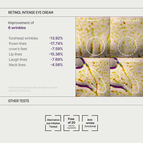 [Retinol Serum] Water, Cyclohexasiloxane, Dicaprylyl Carbonate, Glycerin, Methylpropanediol, 1,2-Hexanediol, Niacinamide, Hydrogenated Poly(C6-14 Olefin), Panthenol, Tocopheryl Acetate, Piper Methysticum Leaf/Root/Stem Extract, Centella Asiatica Extract, Panax Ginseng Berry Extract, Glycyrrhiza Glabra (Licorice) Root Extract, Ficus Carica (Fig) Fruit Extract, Centella Asiatica Leaf Extract, Centella Asiatica Root Extract, Melaleuca Alternifolia (Tea Tree) Leaf Extract, Artemisia Capillaris Extract, Eclipta Prostrata Extract, Melia Azadirachta Leaf Extract, Elaeis Guineensis (Palm) Oil, Hydrogenated Lecithin, Glyceryl Stearate, Bakuchiol, Palmitic Acid, Sodium Polyacrylate, Stearic Acid, Xanthan Gum, Retinol (0.1 %), Acrylates/C10-30 Alkyl Acrylate Crosspolymer, Butylene Glycol, Dipotassium Glycyrrhizate, Adenosine, Tromethamine, Polyquaternium-51, Beta-Glucan, Cetyl Alcohol, BHT, Collagen, Myristic Acid, BHA, Leuconostoc/Radish Root Ferment Filtrate, Tocopherol, Bifida Ferment Lysate, Ceramide NP, Saccharomyces Ferment, Retinal, Asiaticoside, Glyceryl Polymethacrylate, Madecassoside, Propylene Glycol, Polyglyceryl-10 Oleate, Glycolipids, Glycine Soja (Soybean) Peptide, Resveratrol, Sucrose Distearate, Asiatic Acid, Madecassic Acid, Palmitoyl Tripeptide-1, Moringa Oleifera Seed Oil, PEG-100 Stearate, Polysorbate 20, Fragrance, Ethylhexylglycerin [Retinol Eye Cream] Water, Glycerin, Caprylic/Capric Triglyceride, Dimethicone, Polysorbate 60, Niacinamide, Methylpropanediol, Cetyl Alcohol, Polymethylsilsesquioxane, Centella Asiatica Extract, Dioscorea Japonica Root Extract, Piper Methysticum Leaf/Root/Stem Extract, Melaleuca Alternifolia (Tea Tree) Leaf Extract, Panax Ginseng Berry Extract, Artemisia Capillaris Extract, Ganoderma Lucidum (Mushroom) Stem Extract, Chlorella Vulgaris Extract, Glycine Soja (Soybean) Seed Extract, Nymphaea Alba Flower Extract, Elaeis Guineensis (Palm) Oil, Hydrogenated Lecithin, Sodium Hyaluronate, 1,2-Hexanediol, Dimethicone/Vinyl Dimethicone Crosspolymer, Panthenol, BHT, Cyclopentasiloxane, Steareth-21, PEG-10 Dimethicone/Vinyl Dimethicone Crosspolymer, Polyacrylamide, Steareth-2, Isohexadecane, Carbomer, Hydroxyacetophenone, C13-14 Isoparaffin, Tromethamine, Palmitic Acid, Polyquaternium-51, Stearic Acid, Polysorbate 20, Retinol(0.1%), Ethylhexylglycerin, Glyceryl Caprylate, Tocopheryl Acetate, Polyglyceryl-10 Myristate, PEG-30 Dipolyhydroxystearate, Hydroxyethylcellulose, Glycosyl Trehalose, Beta-Glucan, Glyceryl Polymethacrylate, Laureth-7, Butylene Glycol, Disodium EDTA, Hydrogenated Starch Hydrolysate, Adenosine, Raffinose, Dipotassium Glycyrrhizate, Lecithin, Tocopherol, Pentylene Glycol, BHA, Myristic Acid, Tranexamic Acid, Propanediol, Dipropylene Glycol, Disodium Phosphate, Caprylyl Glycol, Collagen, Madecassic Acid, Biosaccharide Gum-1, Asiaticoside, Sodium Palmitoyl Proline, Leuconostoc/Radish Root Ferment Filtrate, Asiatic Acid, Glutathione, Retinal, Madecassoside, Sodium Phosphate, Ferulic Acid, Acetyl Hexapeptide-8, Ammonium Acryloyldimethyltaurate/VP Copolymer, Tetrahydropiperine, Phloretin, Arginine, Fragrance