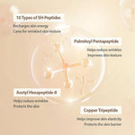 Silk Extract, 1,2-Hexanediol, Ethylhexylglycerin, Water, Butylene Glycol, Glycerin, Methylpropanediol, Chondrus Crispus Powder, Agar, Acrylates/C10-30 Alkyl Acrylate Crosspolymer, Tromethamine, Synthetic Fluorphlogopite, Titanium Dioxide(CI 77891), Iron Oxides(CI 77491), Mica, Gellan Gum, Tin Oxide, Hydrolyzed Collagen, Niacinamide, Carbomer, PPG-13-Decyltetradeceth-24, Tocopherol, sh-Decapeptide-7, sh-Octapeptide-4, sh-Oligopeptide-9, sh-Pentapeptide-19, Caffeoyl Hexapeptide-65, Hydroxyethylcellulose, Adenosine, Disodium EDTA, Betaine, Houttuynia Cordata Extract, Centella Asiatica Extract, Caprylyl Glycol, Palmitoyl Pentapeptide-4, Acetyl Hexapeptide-8, Copper Tripeptide-1, Panthenol, Propanediol, Benzyl Glycol, Hydrolyzed Glycosaminoglycans, Sodium Hyaluronate, Sodium Hyaluronate Crosspolymer, Hydrolyzed Hyaluronic Acid, Hydroxypropyltrimonium Hyaluronate, Hyaluronic Acid, Sodium Acetylated Hyaluronate, Lecithin, Acetyl Glutamine, Bacillus/Folic Acid/Soybean Ferment Extract, sh-Oligopeptide-1, sh-Oligopeptide-2, sh-Polypeptide-1, sh-Polypeptide-11, sh-Polypeptide-9, Collagen, Artemisia Capillaris Extract, Hydrolyzed Elastin, Phenoxyethanol, Magnesium Ascorbyl Phosphate, Gold, Hydrogenated Polyisobutene, Anemarrhena Asphodeloides Root Extract, Squalane